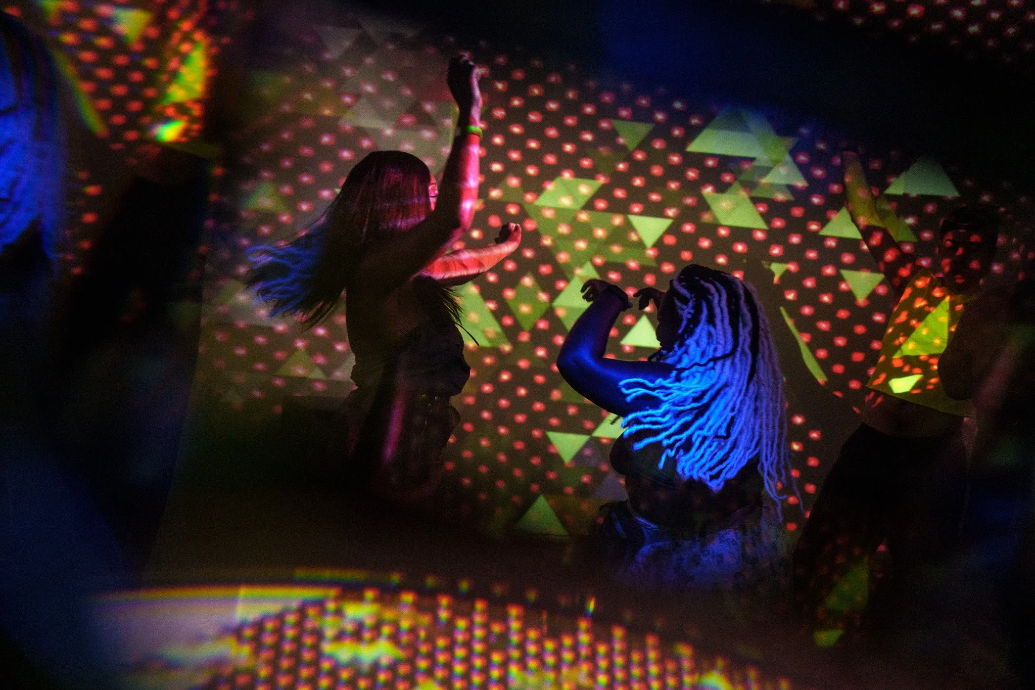Interactive performance installation allowing participants to control audiovisual instruments with handheld controllers.